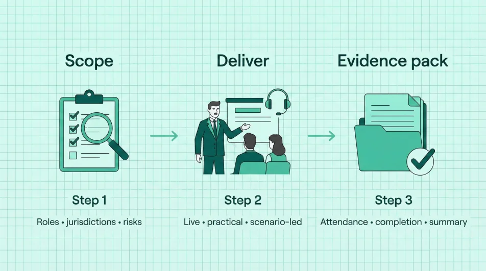 Delivered online, on-site or hybrid — with an audit-ready evidence pack for internal audit and regulator reviews.