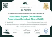 El Programa de Certificación en Lucha contra el Lavado de Dinero (CASS) está acreditado y cumple con las normas internacionales de desarrollo profesional continuo (CPD). Una vez completado con éxito el curso, recibirá el estatus oficial de Especialista Certificado en Lucha contra el Lavado de Dinero (Senior), lo que confirmará su alto nivel de competencia.